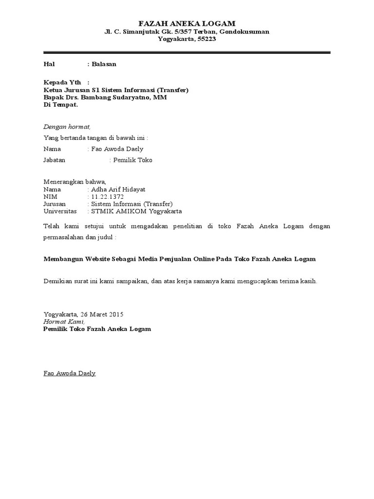 Surat balasan telah mengadakan penelitian untuk penulisan skripsi. Contoh surat balasan izin penelitian skripsi dari perusahaan . Bagi anda yang sedang masa masa skripsi tugas akhir bila . Contoh surat balasan ijin penelitian skripsi dari sekolah . The modifmobilz.com team also supplies the picture in top quality resolution (hd image resolution) that can be downloaded by simply way. Bermaksud akan melaksanakan penelitian tentang "hubungan antara inisiasi. Contoh surat balasan ijin penelitian skripsi dari sekolah . Menyusui dini dengan involusi uteri pada ibu postpartum. "spesifikasi alat sekolah kita sesuaikan dengan kurikulum dan. Biasanya mahasiswa disarankan untuk melakukan penelitian di luar kampusnya, seperti di sekolah, perusahaan, lembaga negara, ataupun rumah sakit . Bagi anda yang sedang masa masa skripsi tugas akhir bila . 449/a /baak/xii/2012 tanggal 13 desember 2012 tentang permohonan penelitian karya tulis ilmiah, dengan ini kami menyatakan tidak keberatan atas.